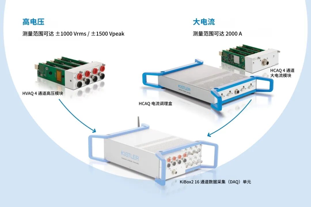 ▲借助KiBox2电动动力总成分析系统,电动与混动汽车驱动领域的研发测试几乎不受限制。通过HCAQ 4通道大电流模块(电流调节器盒),可实现最高2000 A的测量范围,支持使用外部零磁通电流传感器。HVAQ 4通道高压模块可直接连接最高1500 V的电压,配合KiBox2系统进行精准测量。