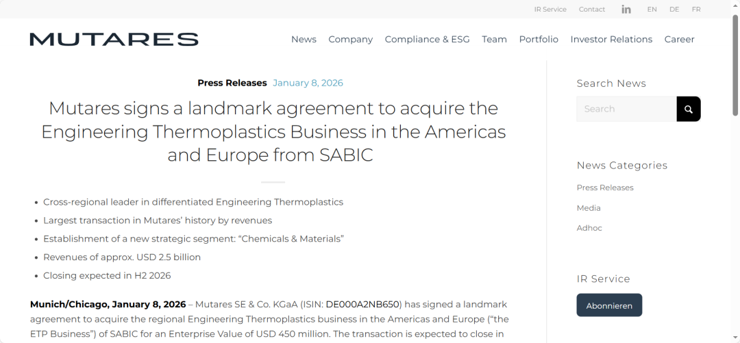 1月8日,德国投资集团 Mutares SE & Co. KGaA(以下简称 “Mutares”)宣布,已与SABIC签署最终协议,以 4.5 亿美元企业价值收购其位于美洲和欧洲区域的工程热塑性塑料业务事业部(简称ETP业务)。该交易为 Mutares 成立以来规模最大的并购项目,预计将于 2026 年下半年完成,具体取决于惯例审批流程。