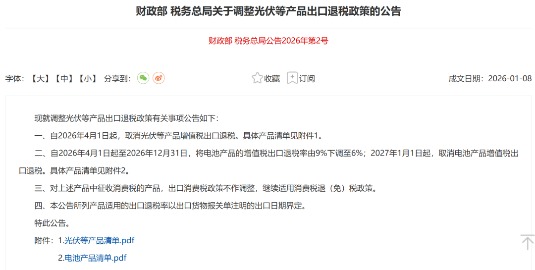 1月8日晚间,财政部、税务总局公告称,自2026年4月1日起,取消光伏等产品增值税出口退税。自2026年4月1日起至2026年12月31日,将电池产品的增值税出口退税率由9%下调至6%;2027年1月1日起,取消电池产品增值税出口退税。