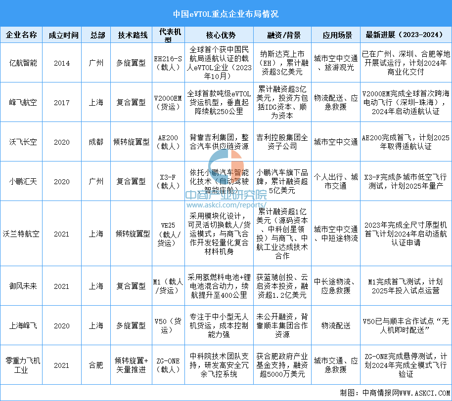 中国eVTOL企业呈现多元化竞争格局,亿航智能、沃飞长空、沃兰特航空、小鹏汇天、峰飞航空等头部企业,通过技术差异(倾转旋翼/复合翼)和场景深耕(载人/物流)抢占市场先机