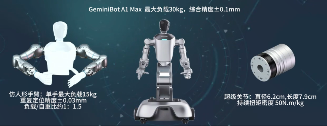 双子智擎推出高负载版本工业级人形机器人Geminibot A1 max。仿人形手臂、超级关节。