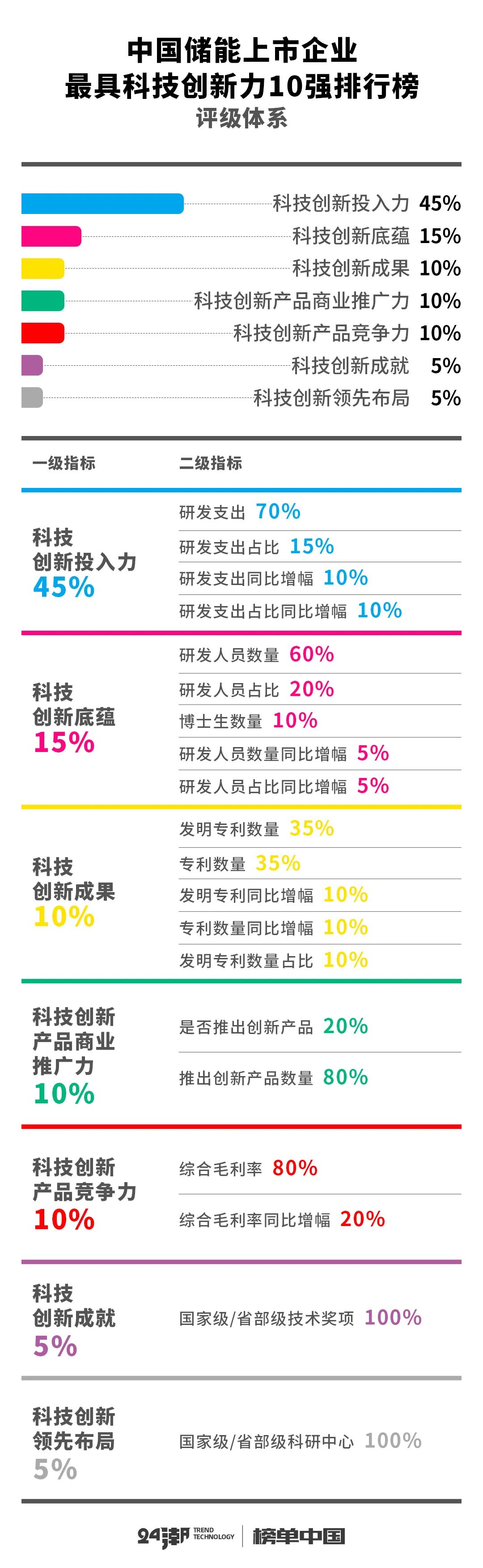 为了方便读者朋友对储能上市企业(包括IPO公司)的科技创新力有一个更为直观的了解,从26年起,24潮产业研究院(TTIR)将持续推出 “中国储能上市企业最具科技创新力10强排行榜”,试图从 “研发投入力”(研发支出)、“研发底蕴”(科技人员)、“科技创新成果”(专利)、“科技创新成就”(国家级/省部级奖项)、“科技创新领先布局”( 国家级/省部级科研中心) 、“科技创新产品商业推广力”、“科技创新产品竞争力”(产品盈利能力)等7个一级维度,20个二级维度全面评比中国储能上市企业科技创新力实力,重点关注头部优质企业对储能产业科技创新力的拉动,以及产业链可持续发展态势,以供读者朋友参考。具体详见下表: