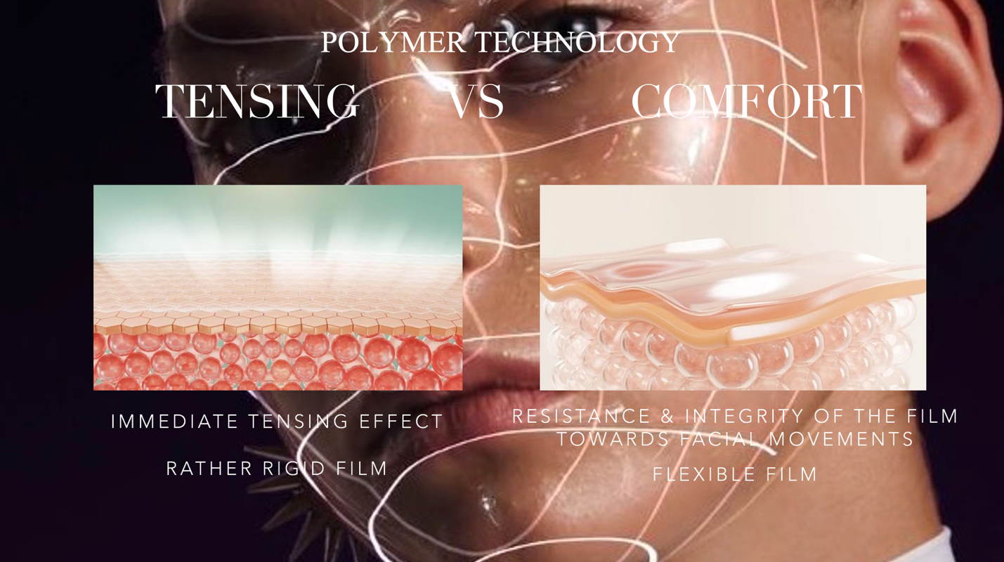 这套技术整合了两种聚合物。第一种是基于海藻酸盐的生物聚合物,具备出色的张力特性,能够提供即时提拉效果;第二种是改性淀粉衍生物,提供长效弹性,确保成膜后保持柔韧而非僵硬。配方中还加入了专用的甘醇增塑剂,保证聚合物链的移动性——这意味着这层膜能够适应面部运动,同时维持紧致效果。
