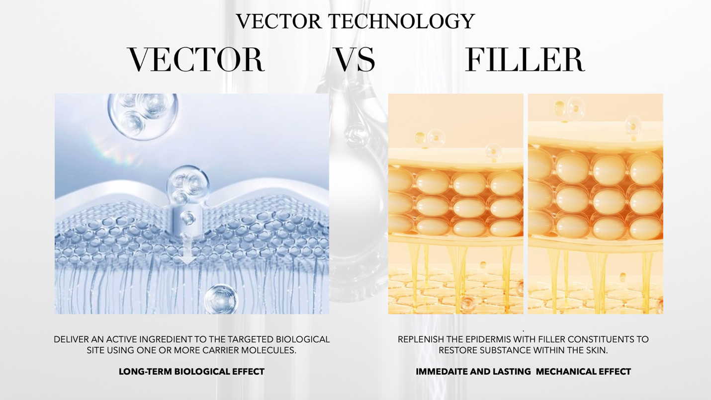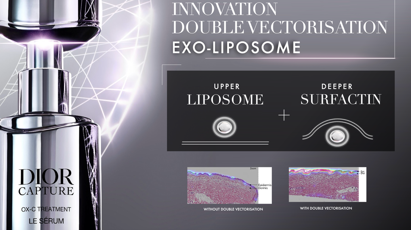 2025 年迪奥 Capture 系列重新推出时,搭载了一项专利双载体技术。这是一套「促渗透双载体」(pro-penetrating duo of vectors)系统,能够将 OX-C 护理成分递送至表皮基底膜,触达皮肤干细胞。Chentoufi 介绍了这套系统的工作原理——