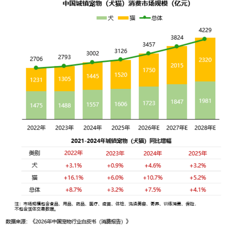 2025年,城镇宠物(犬猫)消费市场规模达3126亿元,较2024年增长4.1%。其中,犬消费市场规模达1606亿元,较2024年上升3.2%;猫消费市场规模达1520亿元,较2024年上升5.2%。预计2028年,城镇宠物(犬猫)消费市场规模达4229亿元。其中,犬消费市场规模达1981亿元,猫消费市场规模达2320亿元。