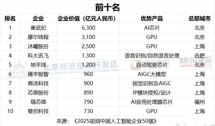 据悉,《2025胡润中国人工智能企业50强》榜单聚焦于主营业务为AI算力或算法的中国企业,主要按照企业价值进行排名,上市公司市值按照2026年1月9日的收盘价计算,非上市公司估值参考同行业上市公司或者根据最新一轮融资情况进行估算。