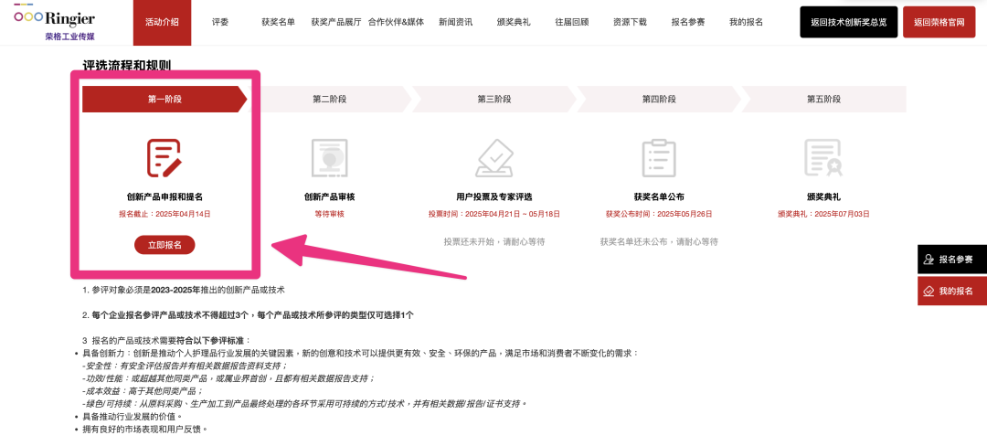 评选流程和规则部分,点击「立即报名」,均可注册荣格会员,进行创新奖作品提交