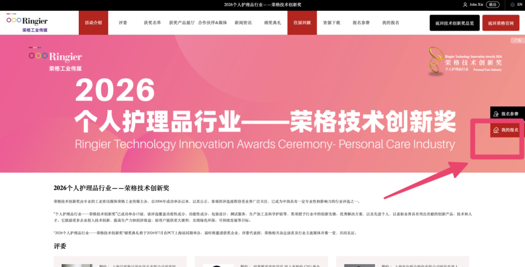 创新奖颁奖庆典将在 7 月于 PCT 2026 个人护理品技术高峰论坛 · 上海站同期举行,届时会邀请获奖企业、评委团代表、研讨会专业观众、荣格相关杂志读者及行业主流媒体齐聚一堂,共同见证。