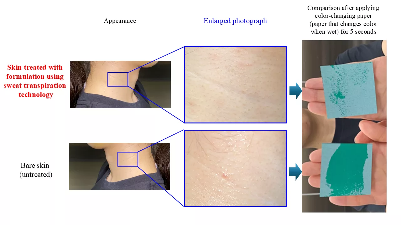 花王株式会社护肤品研究实验室研发出一种能使汗液快速扩散至皮肤表面并加速干燥的技术(汗液蒸发技术)。这项新技术利用汗液的天然功能——通过蒸发带走皮肤表面的热量来降低体温——有望减少皮肤黏腻感,即使在炎热的环境下也能保持肌肤舒适。
