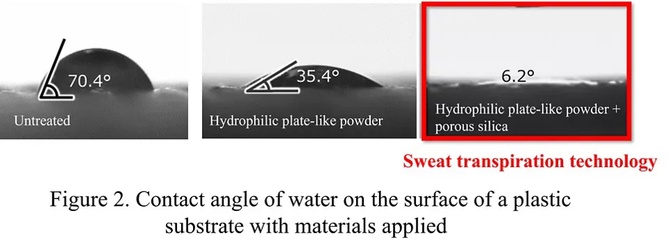 花王公司的研究人员测试了多种材料,以寻找能够形成亲水膜的材料。他们将测试样品涂覆在塑料基底上,滴加水滴,30秒后测量接触角。接触角越小,表明水在表面越容易铺展。测试结果表明,当在表面涂覆某种亲水性片状粉末时,水滴的接触角减小。将这种亲水性片状粉末与多孔二氧化硅结合使用,接触角进一步减小,表明水铺展速度更快。