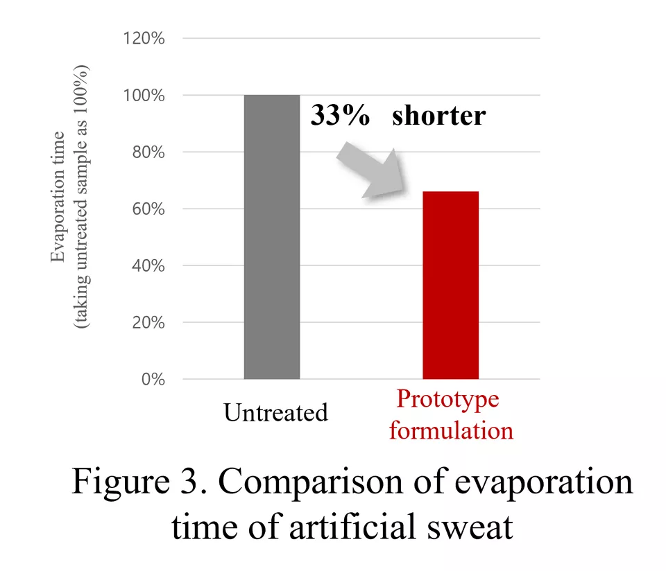 实验中,花王使用合成革模拟皮肤,以验证汗液在大面积区域扩散时是否更容易干燥。将一种含有亲水性片状粉末和多孔二氧化硅的原型配方涂覆在合成革上,并喷洒人工汗液(氯化钠和乳酸的水溶液)。测量人工汗液的蒸发时间(在 30°C、60% 湿度的炎热条件下,测量了 60% 的人工汗液蒸发所需的时间)后发现,涂覆原型配方的样品比未处理的样品蒸发时间缩短了约33%