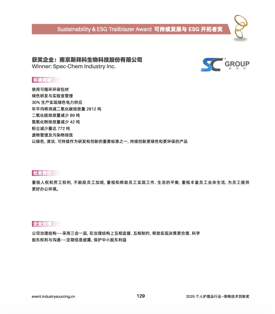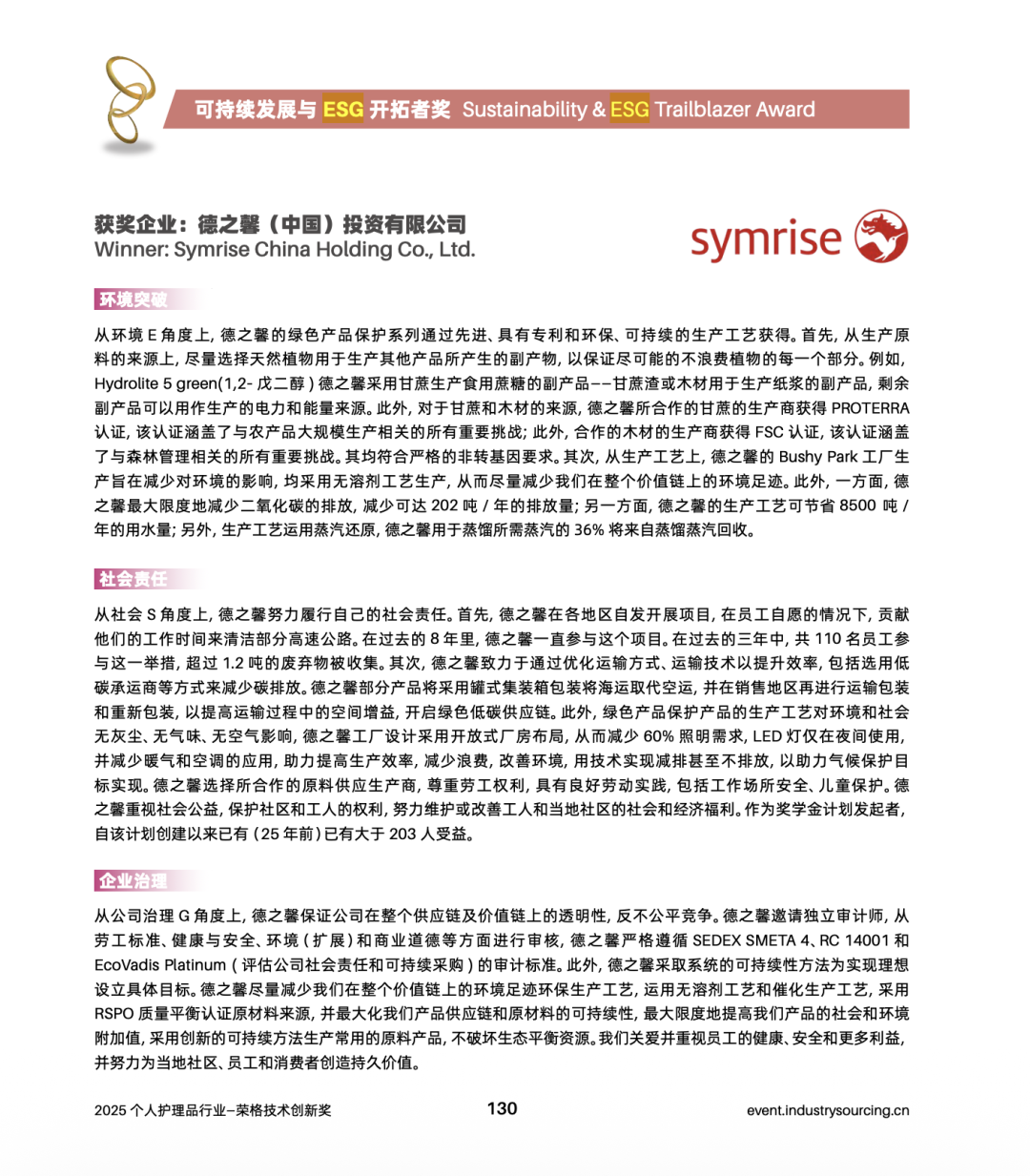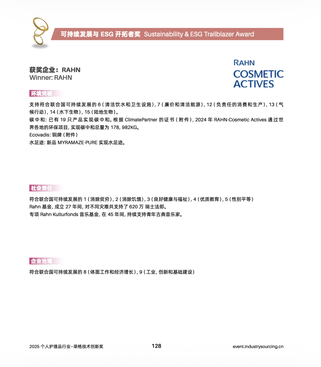 2025 年,「个人护理品行业——荣格技术创新奖」首次设立了「可持续发展与 ESG 开拓者奖」的评选类目,四家企业从申报者中脱颖而出。这一奖项的设立,标志着行业对 ESG 议题的关注正从概念层面走向实践评价。