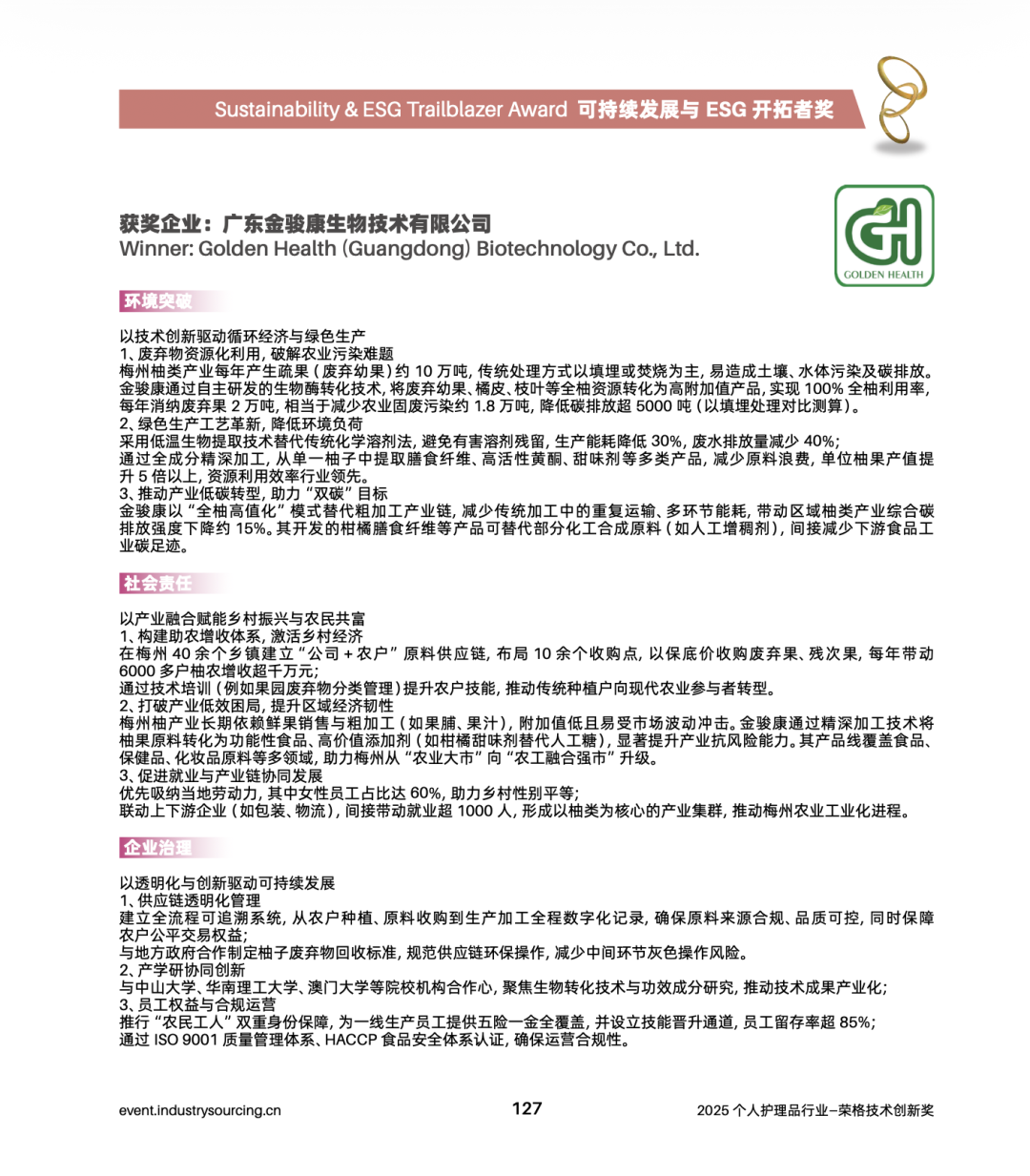 金骏康的实践路径引起了评委的关注。这家企业从农业废弃物入手,将梅州柚类产业每年产生的约 10 万吨疏果转化为高附加值产品,实现全柚利用。王茁认为这一路径具有示范意义:「从自己的上游尽量去影响,因为你对上游的影响力会偏大一些,推进可持续会更有效。」