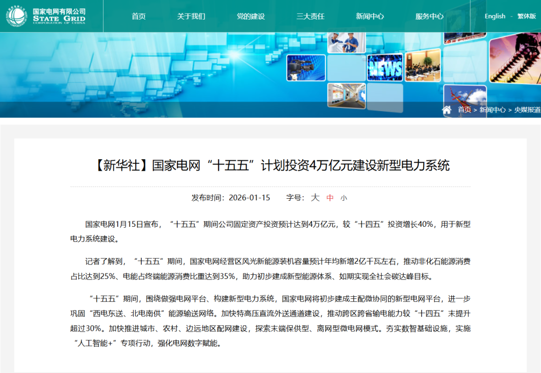 2026年1月15日,国家电网有限公司正式发布“十五五”投资计划,官宣未来五年将投入4万亿元用于新型电力系统建设,较“十四五”投资规模直接增长40%,创下电网五年投资历史最高纪录。