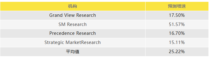 主要海外市场调研机构预测的全球脑机接口产业未来五年增速(单位:%)