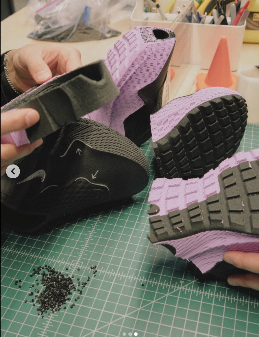 紫黑配色方案展示了Zellerfeld在多色3D打印技术上的突破。该公司此前展示过可同时打印支撑材料与构建材料的自研3D打印机,如今已实现多色打印能力。从官方图片可见,该技术能实现全鞋面多色贯穿打印——当前案例中似乎运用了双构建材料的支撑喷头技术。鞋底部位呈现出多侧面分区着色、不同区域异色配置以及色彩渐变融合的复杂效果。