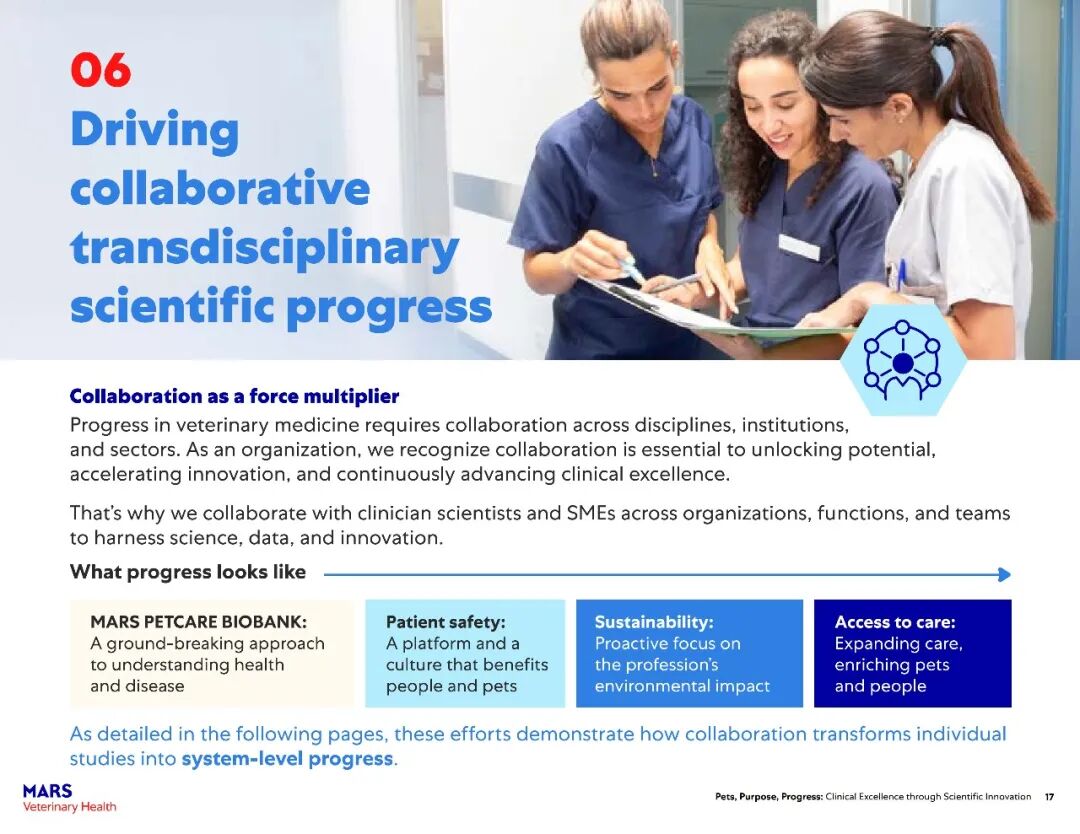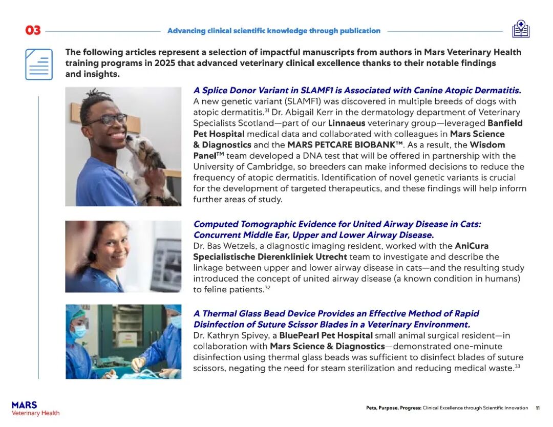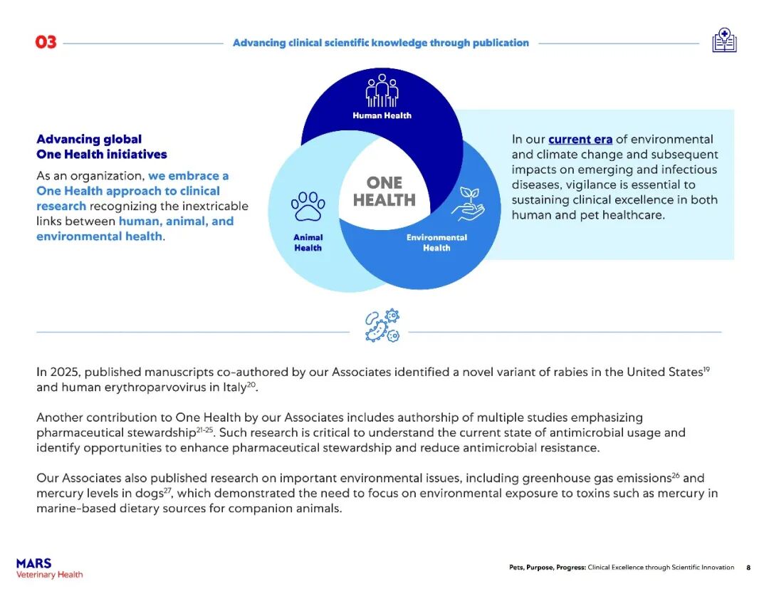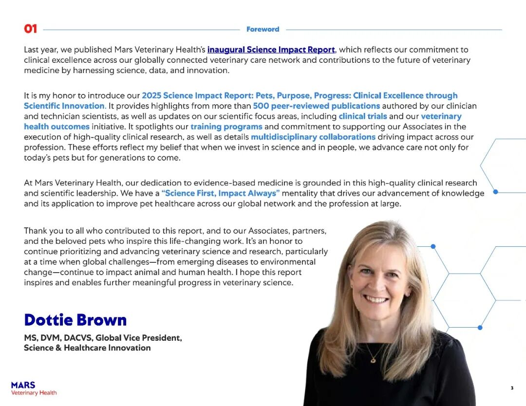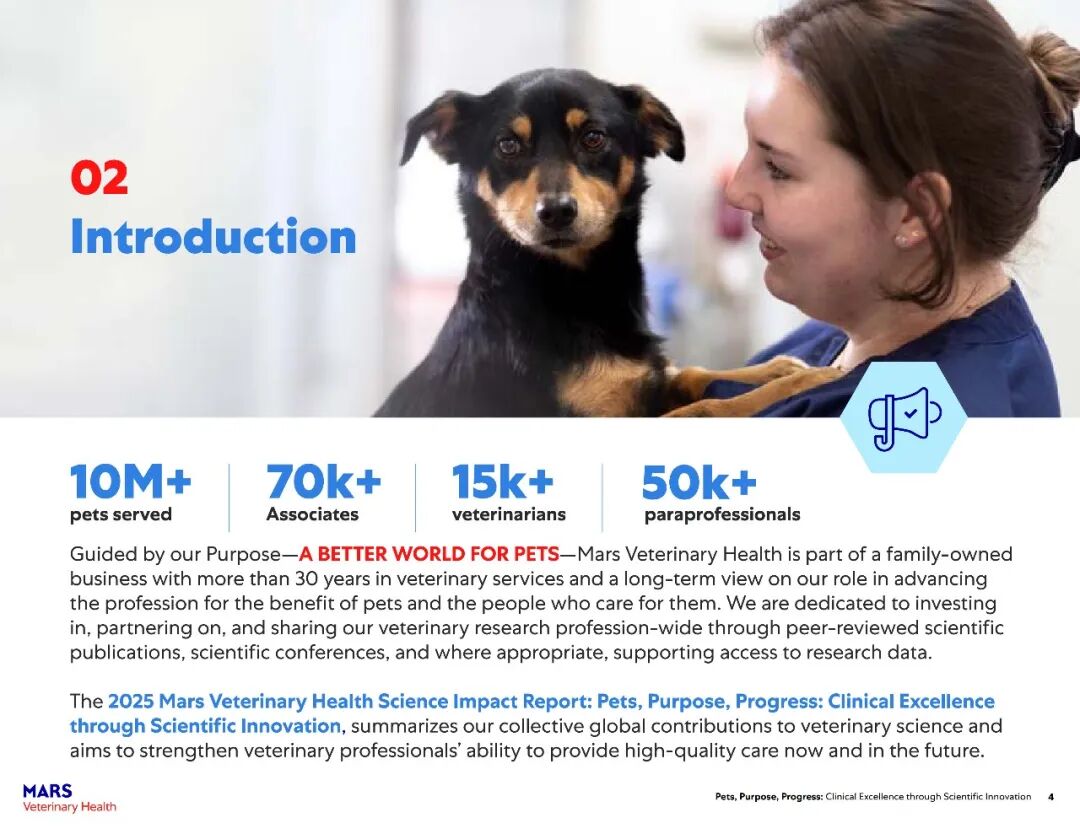 该报告主要展示了玛氏宠物医疗全球互联护理网络在过去一年中兽医科学研究的快速进展。2025年,报告涵盖了其临床科学家发表的500多篇经过同行评审的论文,以及推动宠物医疗未来发展的全球项目——包括临床研究基础设施建设、“同一健康”领域的突破、可持续发展科学的持续进展以及新型健康结果工具的开发。