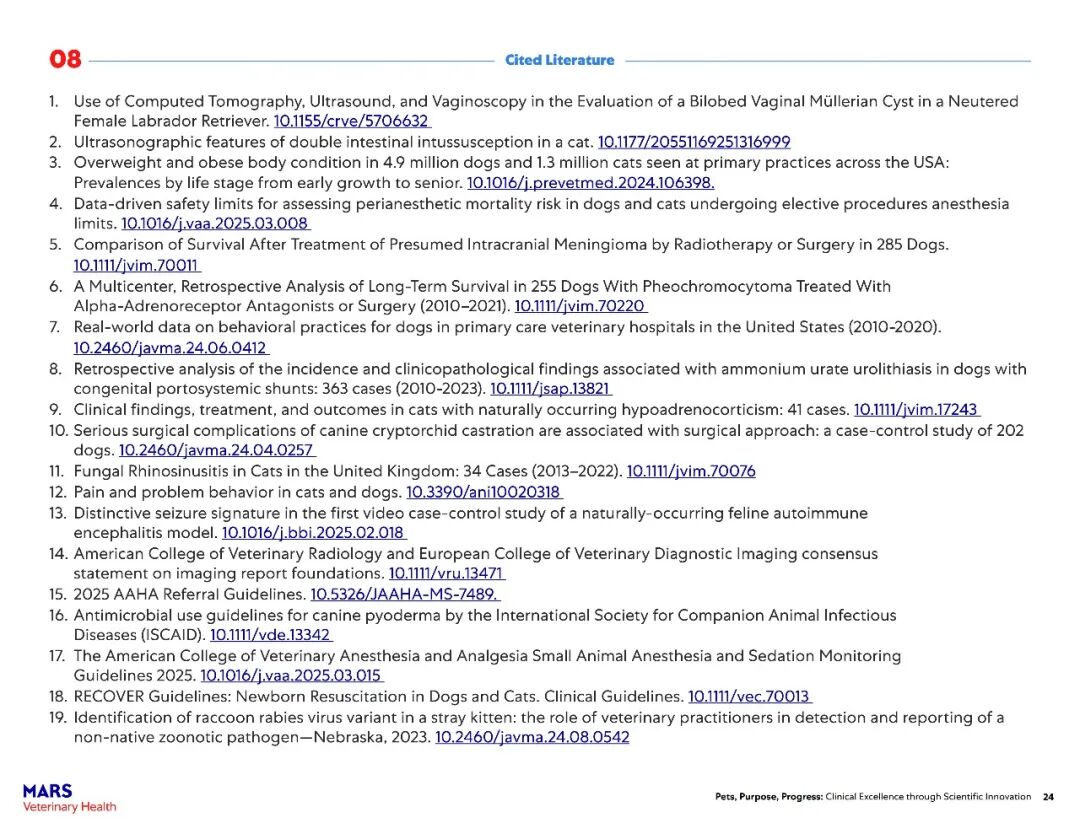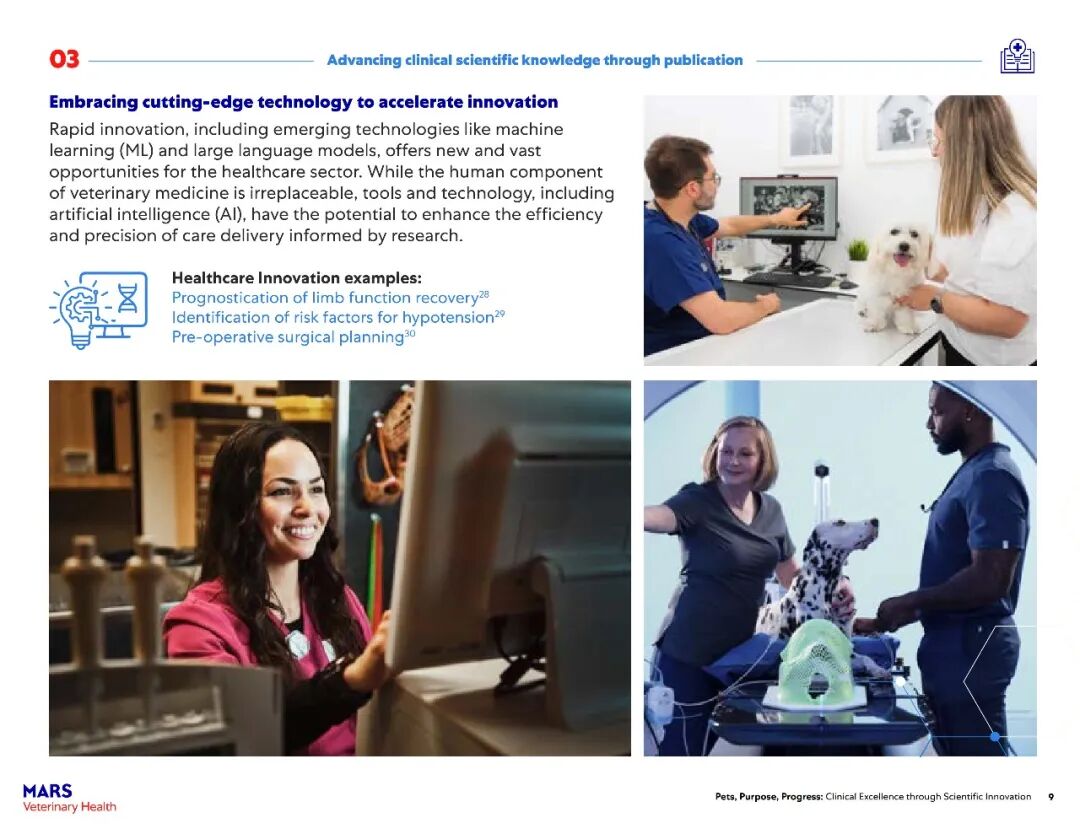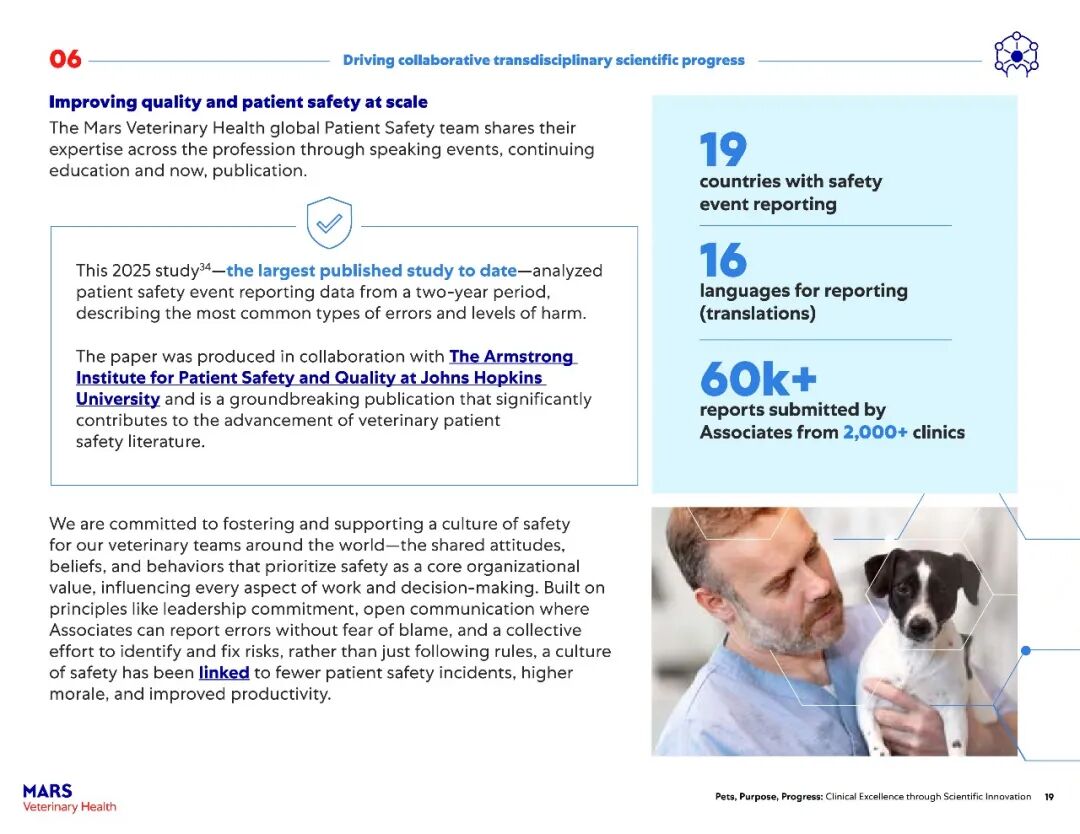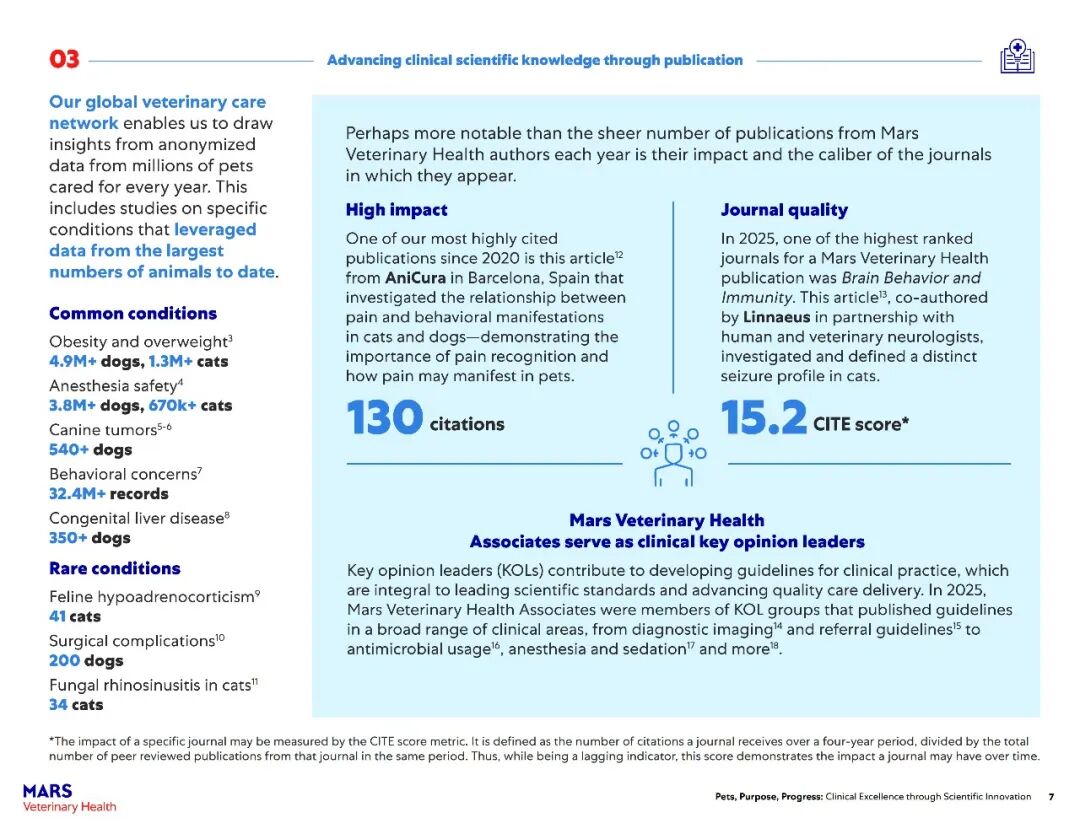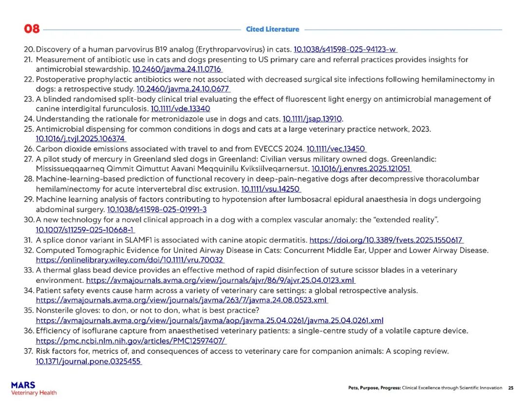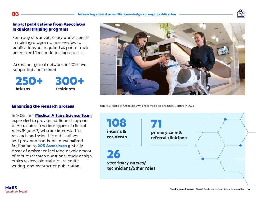 该报告主要展示了玛氏宠物医疗全球互联护理网络在过去一年中兽医科学研究的快速进展。2025年,报告涵盖了其临床科学家发表的500多篇经过同行评审的论文,以及推动宠物医疗未来发展的全球项目——包括临床研究基础设施建设、“同一健康”领域的突破、可持续发展科学的持续进展以及新型健康结果工具的开发。