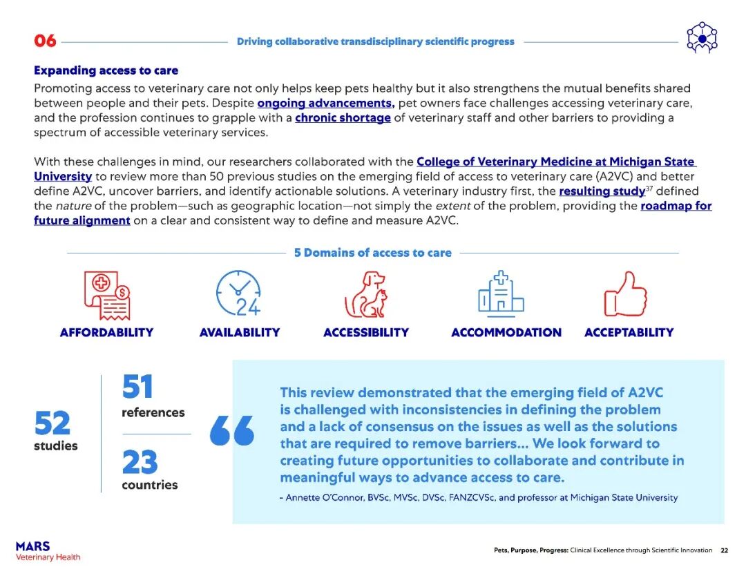 改善医疗服务可及性:与密歇根州立大学合作开展范围界定审查,建立首个“获得兽医服务(A2VC)”指标和框架,推动全球研究和政策制定。