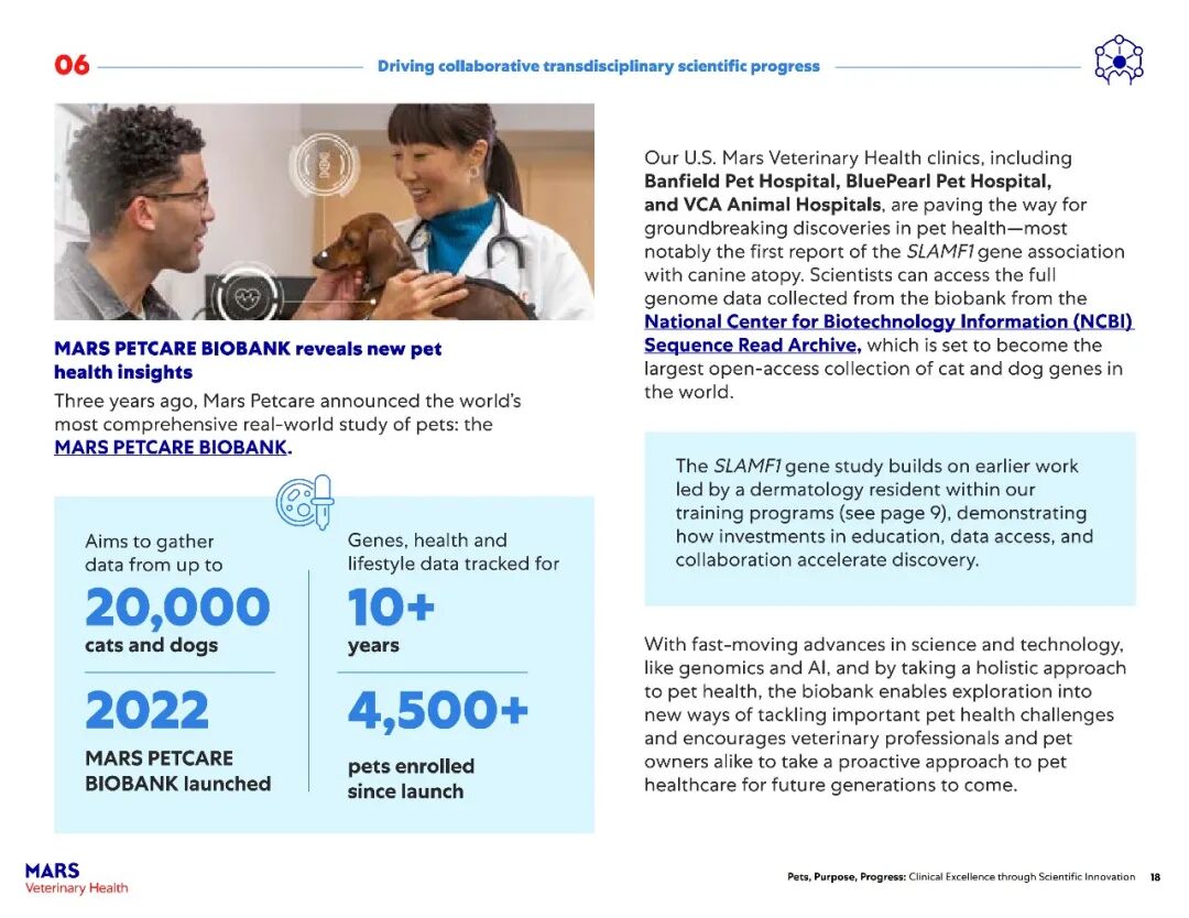 玛氏宠物医疗生物样本库™助力基因发现:三年来已收录超过4500只宠物,数量持续增长。研究发现与犬特应性皮炎相关的SLAMF1基因变异,并加速与学术伙伴合作开发新型DNA检测方法。生物样本库中的全基因组数据可通过美国国家生物技术信息中心(NCBI)序列读取档案库获取,预计将成为全球最大的猫狗基因开放数据库。