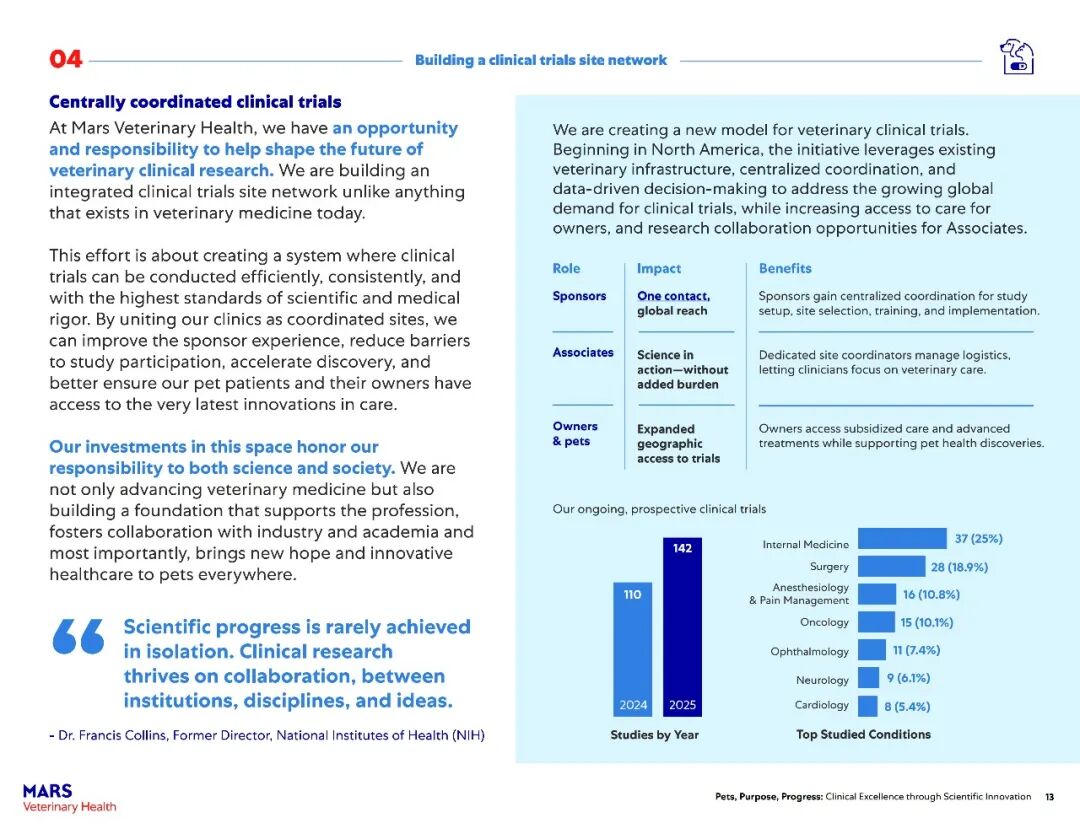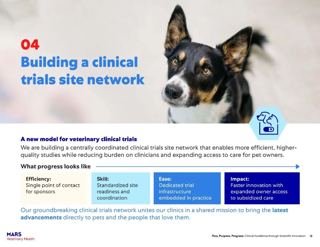大规模整合兽医临床研究:构建全球一体化兽医临床试验中心网络,打造充满活力、稳健且蓬勃发展的临床试验生态系统,简化研究流程,减少运营障碍,加速发现并扩大变革性医疗服务的覆盖范围。