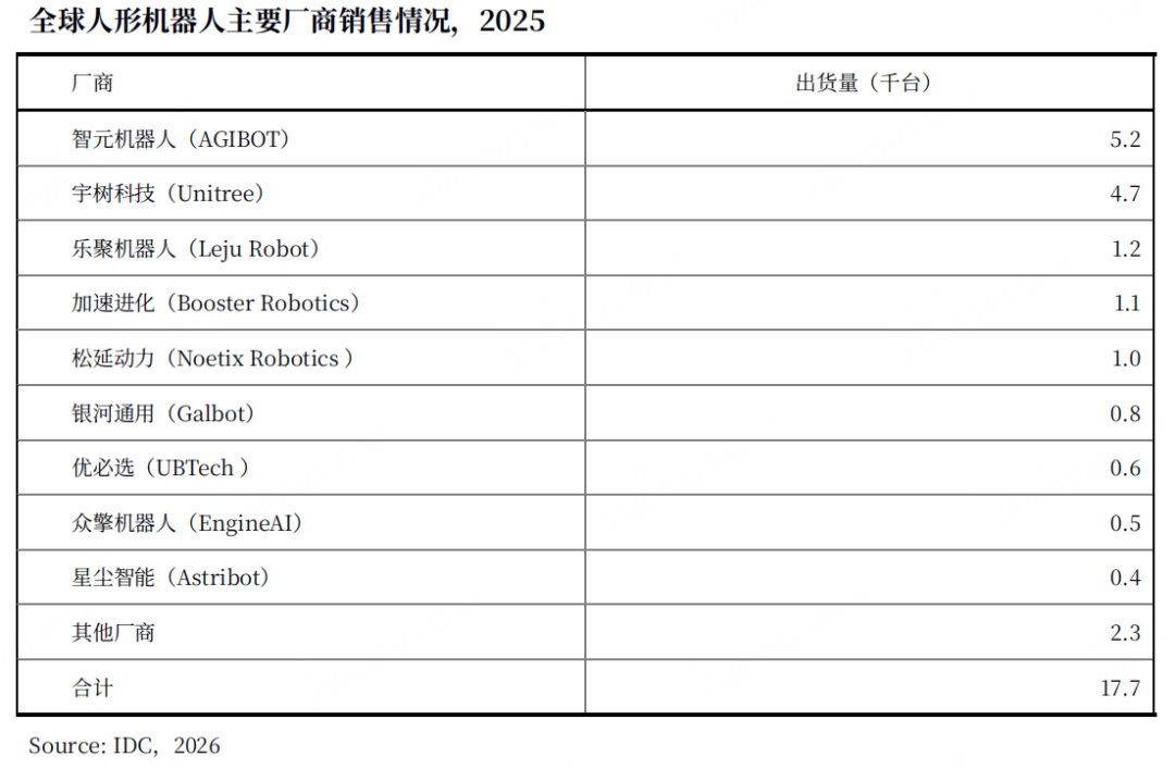 根据IDC数据,2025年,全球人形机器人出货量约1.8万台,同比增长约508%,中国厂商占主导,智元以5200台的出货量稳居全球榜首,市场份额显著领先。这一数据标志着智元不仅完成了从技术研发到产品量产的关键跨越,更在规模化交付这一硬性指标上体现了优势,确立了在全球市场的领导者地位。