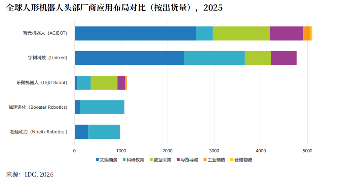 报告提到,目前,人形机器人市场的应用场景呈现出多元化发展的趋势,需求主要来自文娱商演、科研教育、数据采集、导览导购、工业智造与仓储物流六大场景,其中智元在五个场景出货量均位列第一。