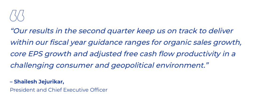今年 1 月 1 日正式接任 CEO 的 Shailesh Jejurikar 在声明中表示,宝洁在充满挑战的消费环境和地缘政治格局下,仍有望完成全年业绩指引。