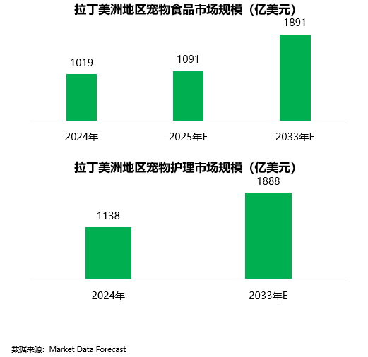 2024年,拉丁美洲宠物食品市场规模为1019亿美元,预计2025年将达到1091亿美元,到2033年将达到1891亿美元,2025年至2033年的复合年增长率为7.1%。