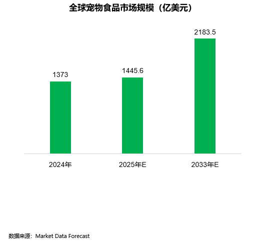 全球宠物食品市场在2024年的估值为1373亿美元,预计2025年将增长至1445.6亿美元,而到2033年将达到2183.5亿美元。在2025年至2033年的预测期内,该市场将以5.29%的复合年增长率增长。