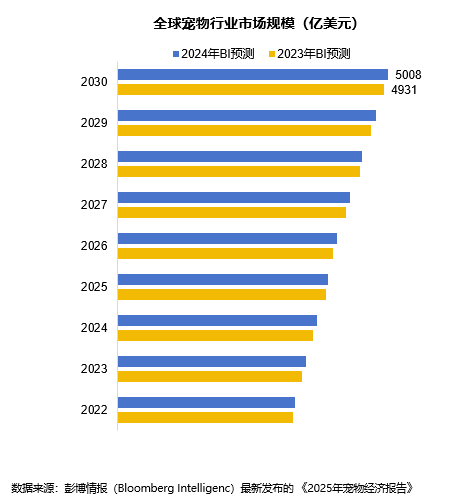 全球宠物行业未来五年预计将增长45%,到2030年将超过5000亿美元,达到5008亿美元。该数据较BI于2023年报告预测的4931亿美元上升了77美元。宠物拥有率的提高、宠物食品销售的扩大、健康福利行业的发展及人性化趋势的持续,将推动这一增长。