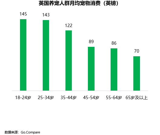 2024年,英国养宠人群月均宠物消费112英镑。其中,Z世代(18-24岁)年轻人群月均宠物消费145英镑,超过其他任何年龄段养宠人群。