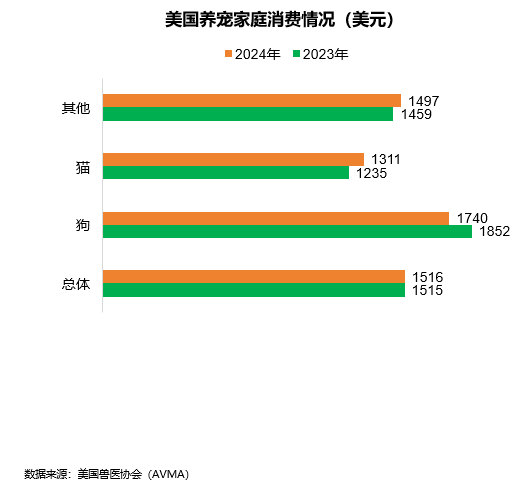 2024年,美国养宠家庭在宠物上(不包括领养或购买费用)总体人均支出为1516美元,其中,狗主人平均支出1740美元,猫主人平均支出1311美元。