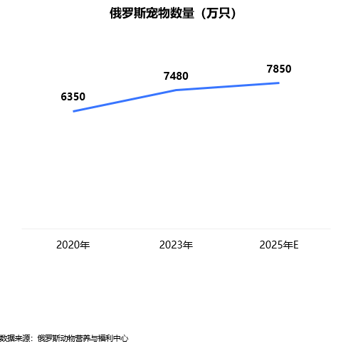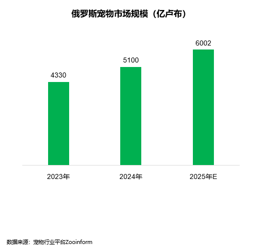 2024年,俄罗斯与宠物相关的产品市场总规模超5100亿卢布(约合64.47亿美元)。预计每年市场规模以17.7%的速度增长,2025年预估将达到6002亿卢布。