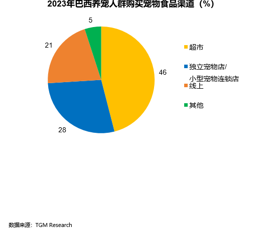2023年,巴西养宠人群在宠物食品购买渠道选择以超市为主,占比46%,其次是独立宠物店/小型宠物连锁店、线上渠道,分别占比28%、21%。