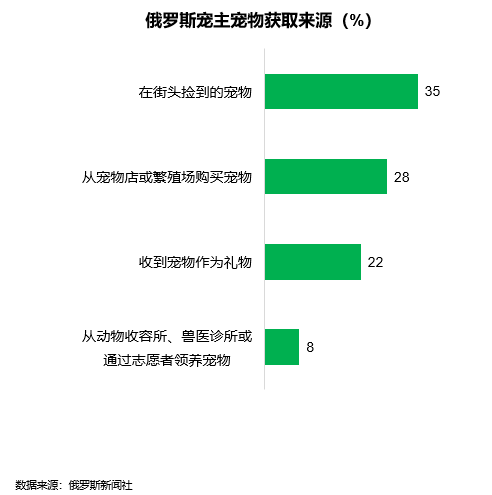 俄罗斯宠主主要获取宠物的来源是在街道捡到的宠物、从宠物店或繁殖场购买、宠物作为礼物,分别占比35%、28%、22%。