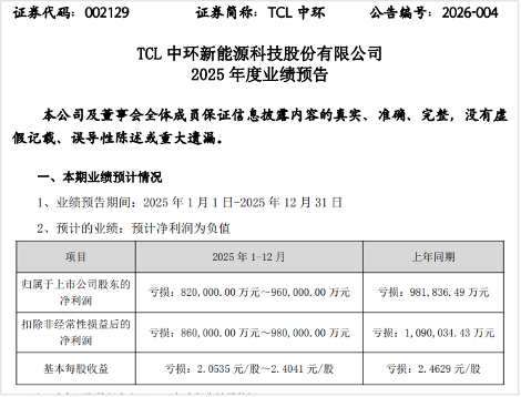 在上述发布业绩预报的9家光伏龙头中,通威股份以惊人的90亿-100亿元的预亏成为2025年的“亏损王”。按预亏额度高低排序,TCL中环、天合光能、隆基绿能、晶科能源分别名列第二、第三、第四和第五。