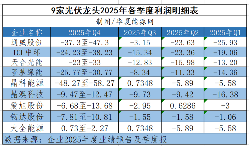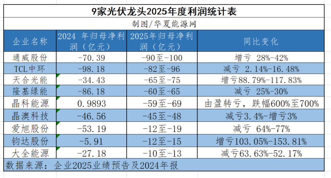 华夏能源网统计发现,2025年,仅通威股份(SH:600438)、TCL中环(SZ:002129)、天合光能(SH:688599)、隆基绿能(SH:601012)、晶科能源(SH:688223)晶澳科技(SZ:002459)、爱旭股份(SH:600732)、钧达股份(SZ:002865)、大全能源(SH:688303)这9家光伏龙头预亏就合计超过435亿元,最高或达500亿元。