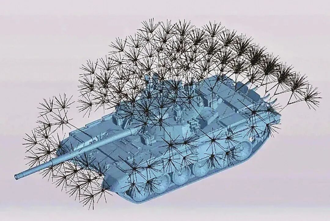 在该系统中,“蒲公英”的枝干由玻璃纤维复合材料制成,既保证了一定强度,也减轻了重量。单套“蒲公英”的重量仅有金属格栅的1/3~1/4,有助于装甲车辆机动。因为材质是玻璃纤维,带有一定韧性,加上其独特的多层分支和向上开叉布局,“蒲公英”不仅能在相对狭窄的环境中发生变形并通过,而且在一些林区行进时,不易被树枝等钩挂、阻挡。