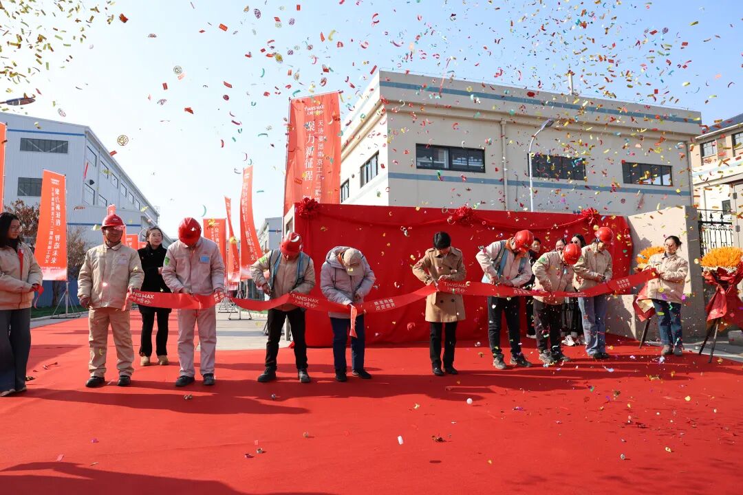 随后,现场进入激动人心的揭幕剪彩环节。伴随着礼炮响起,在彩烟的璀璨绽放中,于天诗教授与项目成员手持金剪剪断彩带,为项目竣工剪彩喝彩。随后,项目成员一同拉动红绸,为二期工厂门头正式揭幕,崭新的厂牌熠熠生辉,象征着二期项目全面投入使用,也标志着公司迈向智能化、规模化发展的新起点。