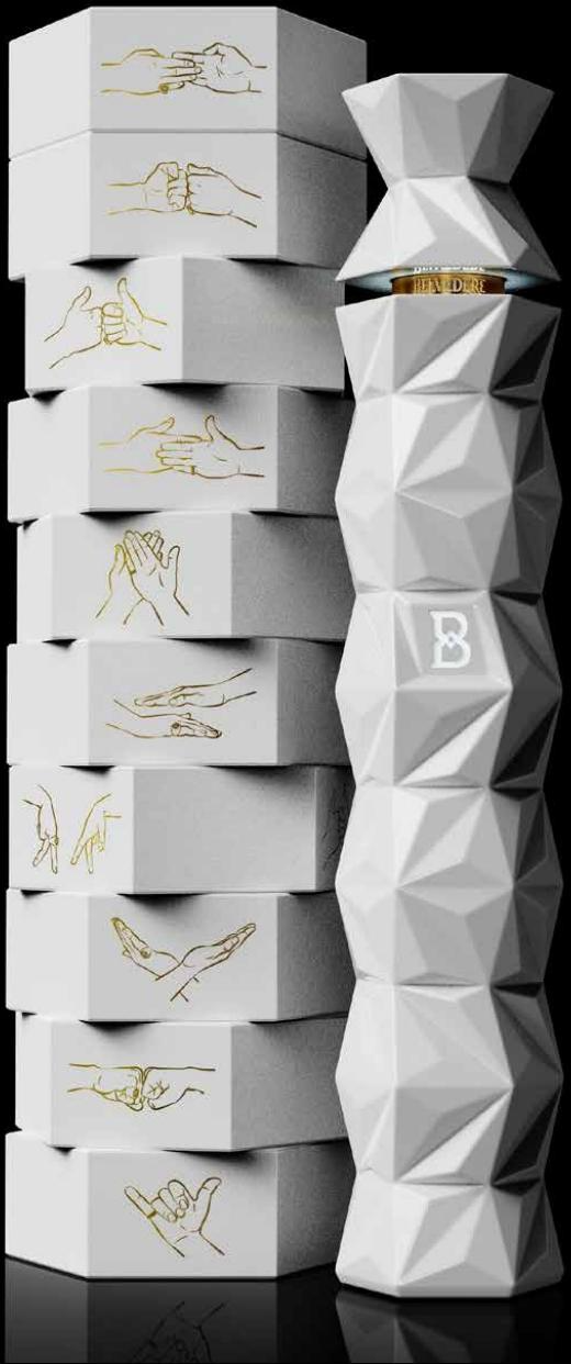 在LOVE. 设计团队的协助下,Belvedere 10 以极具戏剧张力的网红及媒体礼包 发布其全新伏特加——一款覆以金箔的圆柱形解谜包装,滑动开启后便能看到 酒瓶。隐藏式密码元素与撕拉条设计,将趣味与奢华结合,营造出令人难忘、引 发话题讨论的开箱体验。该设计不仅呼应了“游戏开始!”(Game On!) 趋势,其 雕塑般的造型也契合了“收纳的艺术”的理念。