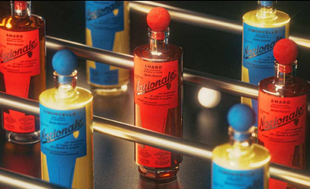 饮料货架上一款有趣的产品,Nazionale — Spirito Italiano by Auge 是一款高端的柠檬利口酒和苦酒,以俏皮的方式致敬意大利传统。其设计灵感来自酒吧文化及桌上足球的社交仪式感,瓶身仿照球员形象:红队对蓝队,球形瓶盖作为“头部”,标签构成“身体”和“足球”,并辅以压印 Logo 和模切徽章等触感细节。