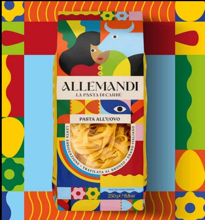 ALLEMANDI La pasta di Carru 的活力设计为厨房架带来了意想不到的色 彩,彰显了传统和工艺。DISPENSER Studio 设计师以当地引以为傲的肥牛为 标志,希望在包装设计中反映出情感传承;通过色彩和形状的爆发,庆祝共享一 盘意大利面的乐趣。