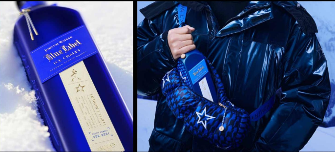 Johnnie Walker Blue Label Ice Chalet 是与滑雪时装品牌 Perfect Moment 的 限量版合作,将威士忌重新定义为奢侈品时尚配饰。这款由 Bulletproof 设计的 酒品采用钴蓝色可翻转斜挎式羽绒包,饰有超大千鸟格纹,既契合滑雪后的休闲 文化,又具备多功能性——从威士忌酒袋转变为可穿戴的时尚包袋,体现了两大品 牌的创意与突破精神。
