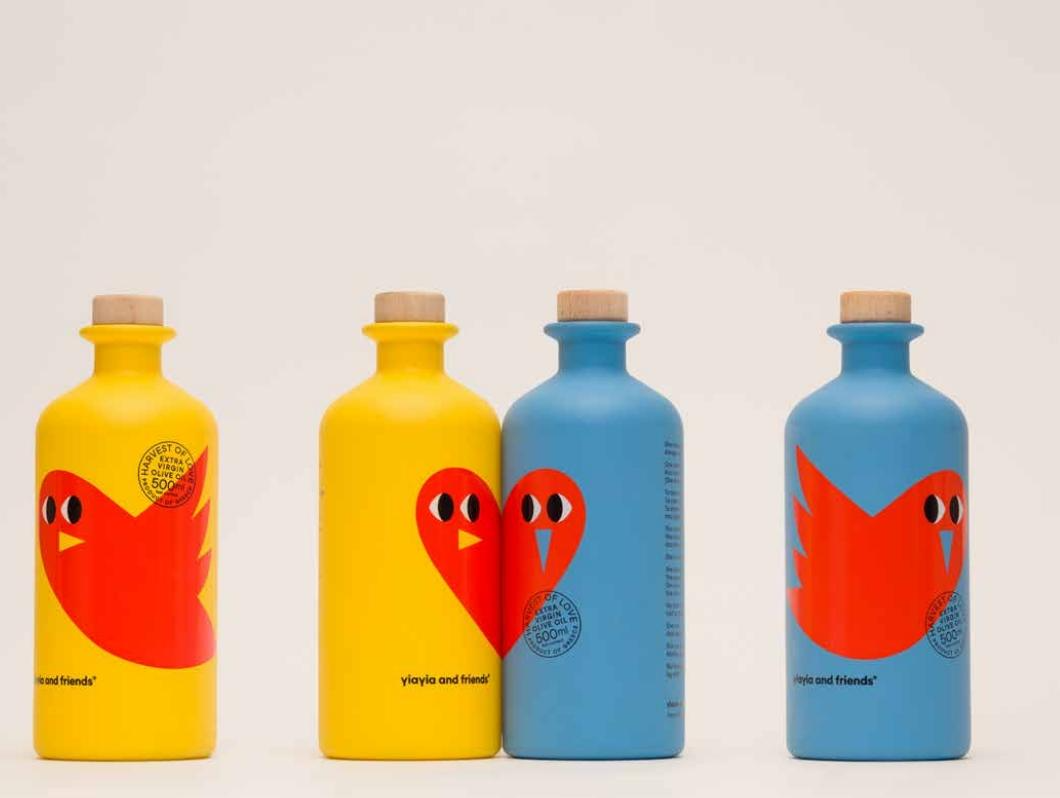 食品品牌yiayia and friends的“Harvest of Love”橄榄油系列,是设计机构BEETROOT DESIGN打造的限量版周年纪念特级初榨橄榄油。该设计以两只相互依偎的鸟儿为核心灵感,瓶身采用模块化造型,多瓶并排陈列时可自然拼接成爱心形态。其明亮的颜色、相互交织的形象、简约的设计,诠释了品牌天真烂漫的风格。