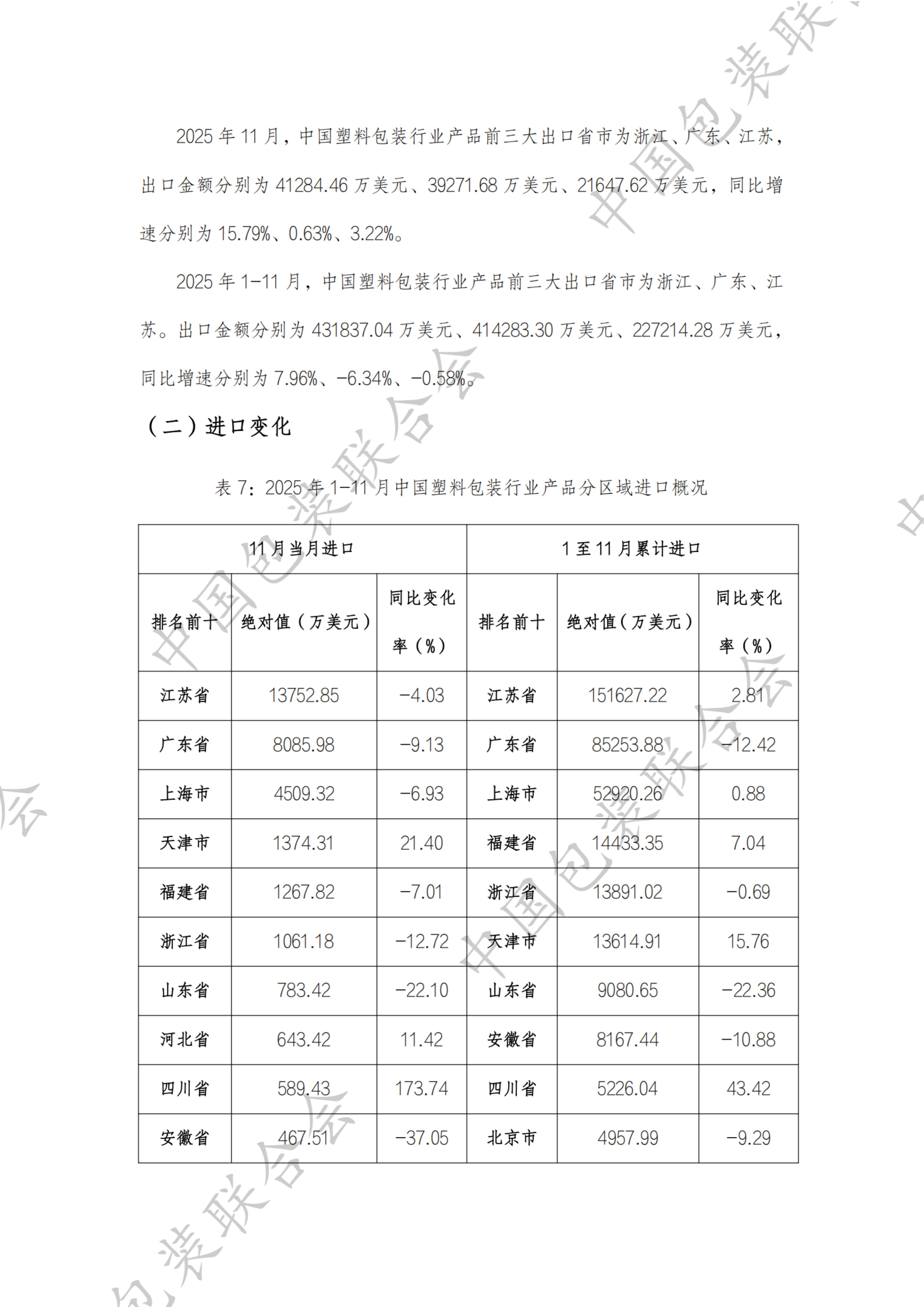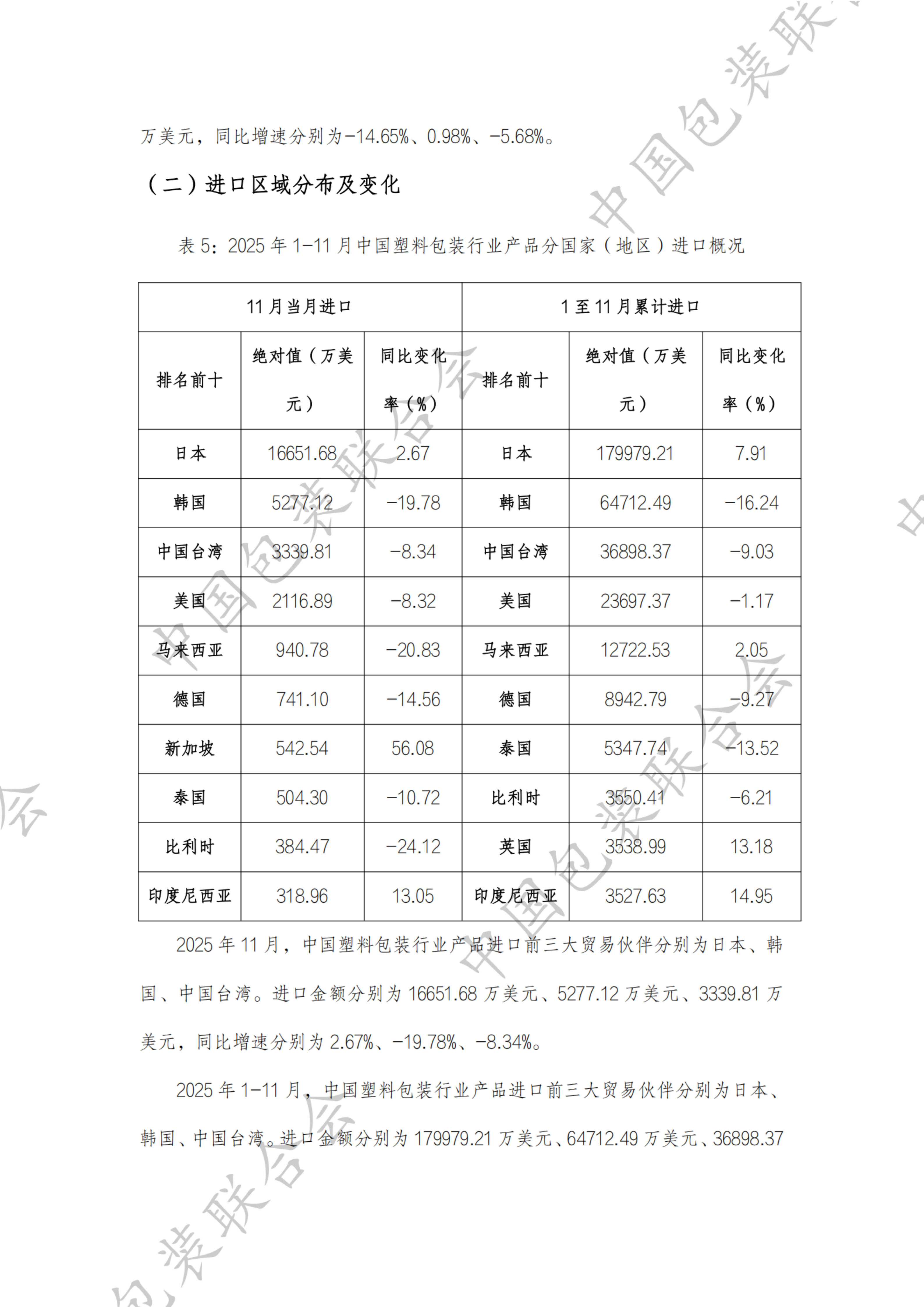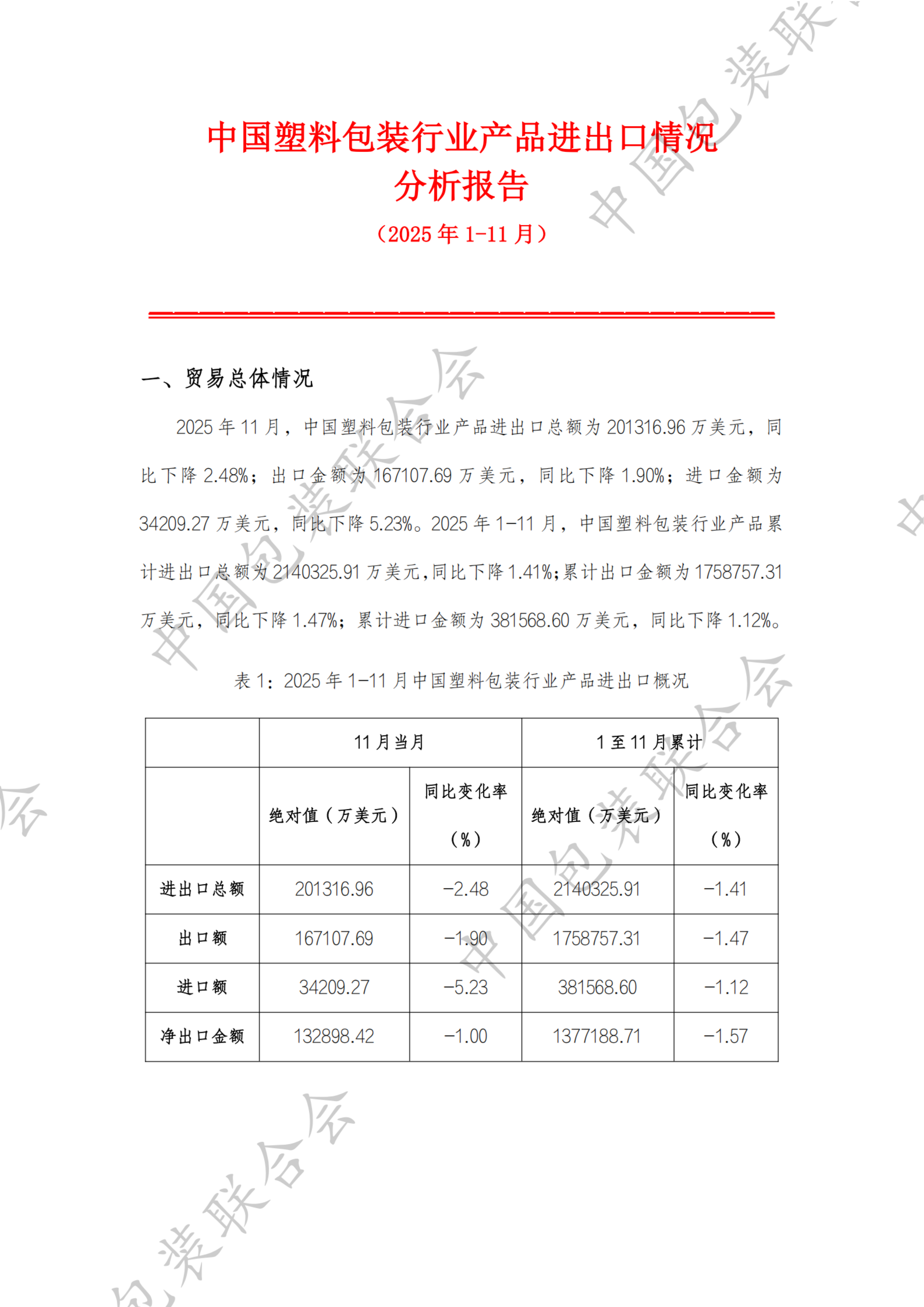 近期,中国包装联合会发布了我国塑料包装行业产品进出口情况分析报告(2025年1-11月)。报告指出,2025年1-11月,中国塑料包装行业产品累计进出口总额为2140325.91万美元,同比下降1.41%;累计出口金额为1758757.31万美元,同比下降1.47%;累计进口金额为381568.60万美元,同比下降1.12%。