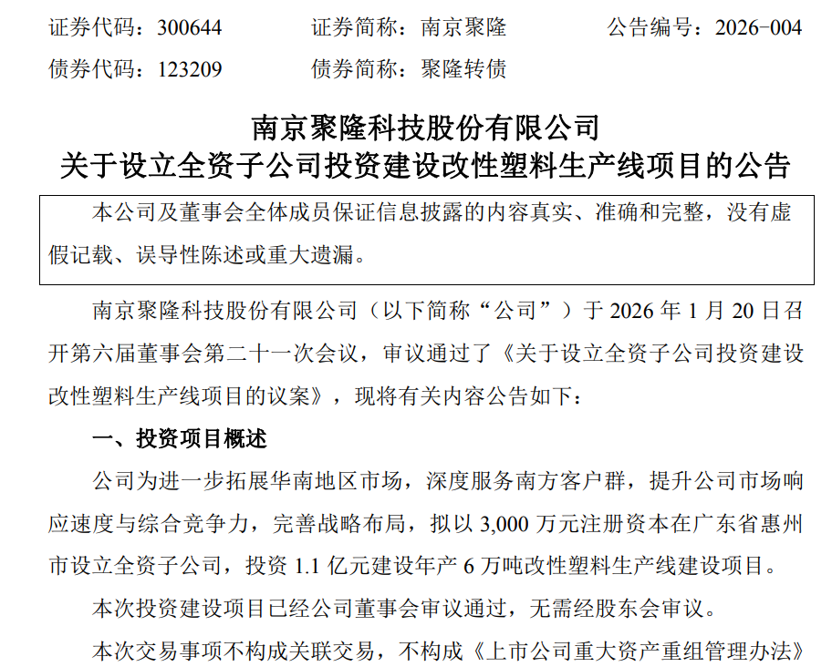 南京聚隆1月20日公告,公司拟以3000万元注册资本在广东省惠州市设立全资子公司,投资1.1亿元建设年产6万吨改性塑料生产线建设项目。本次设立全资子公司投资建设年产6万吨改性塑料生产线建设项目,可显著加大华南地区的业务拓展力度,更好地满足华南客户的订单需求,深度服务南方客户群,弥补当前华南市场响应效率低的短板。