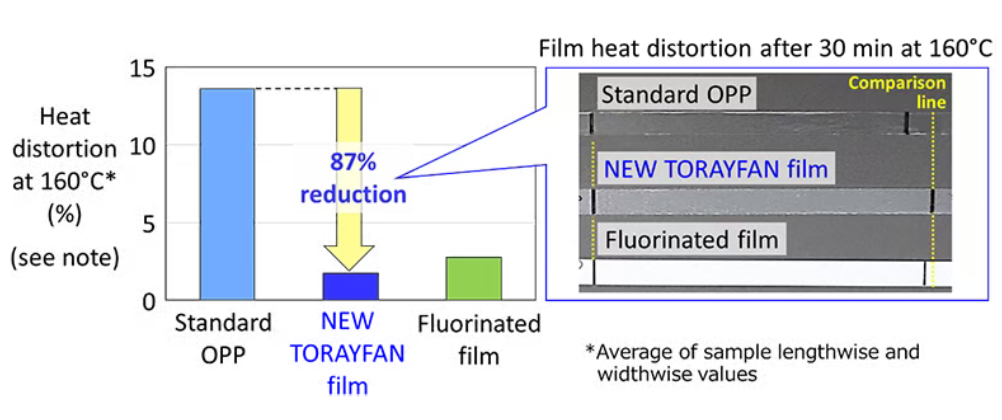 新的TORAYFAN源于东丽公司用于OPP薄膜的高耐热技术进行强化,并将其与一种采用高耐热聚烯烃树脂的新高耐热表面技术相结合。这使得在160°C时的热变形量降低到了标准OPP薄膜的约十分之一。此外,它还降低了润湿性,这将带来出色的释放性能。