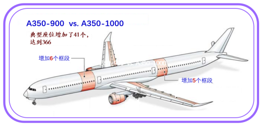A350-1000在典型的双舱布局下已可容纳约369名乘客。若加长数个机身框,其客舱在高密度配置下可接近440个座位,这使其直接进入777-9的市场领域。