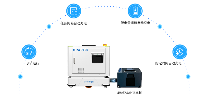 48v/24Ah高效供电,可持续运行超8小时,支持任务间隔、低电量、指定时间自动充电。